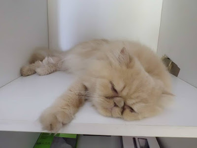 entufada de pello branco malhado de ouro, gosava de leve uma sesta macia.
